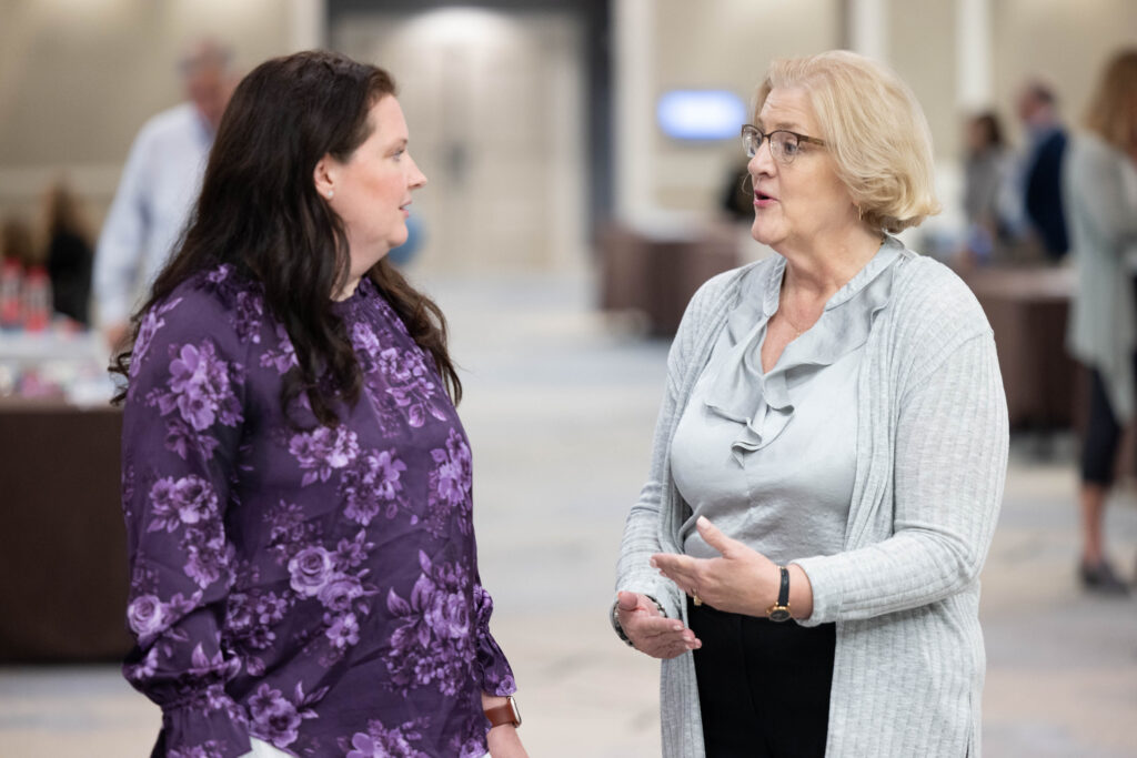 Terri (right) speaking with Leslie Urdaneta, Director of Family Support and Pathways Program, at the 2025 National MPS Society Family and Scientific Conference.